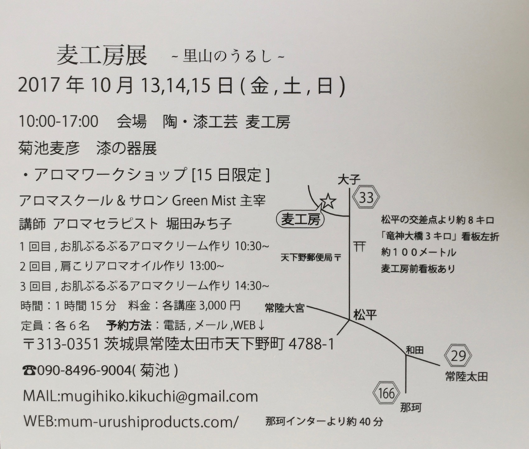 いよいよ!! 2017.10.8 いよいよ麦工房展は今週末です 10月13,14,15日の3日間 10:00~17:00 明日からはお山にこもって準備を始めます 金曜からお天気が心配ですが、雨でも問題ありません 今年も工房展限定作品ありますよ!! 是非この機会にご来場ください お待ちしています 明日からはインスタやFBでご報告いたします ワークショップのご参加もお待ちしています それから、それから、アウトドア漆器「kiik」の新作サンプルをご用意しています まだ購入はできませんが予約受付をしたいと思います 販売は冬頃を予定しています そちらも見に来てくださいね~