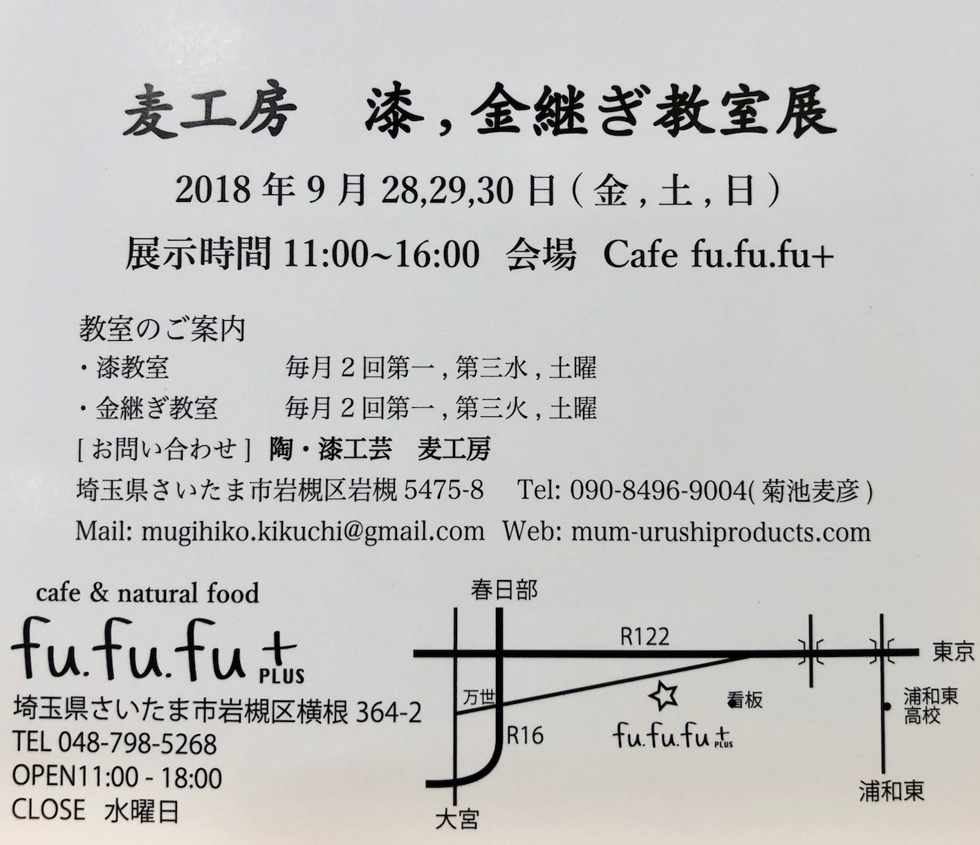 麦工房漆金継ぎ教室展 2018.9.16 こんにちは 今月は漆、金継ぎ教室展があります 9月28,29,30日の3日間です 麦工房教室は今年で3年目を迎えました 生徒の皆様は長い時間をかけて丁寧に作り上げてきました 螺鈿や変り塗りなどの力作もあります 是非この機会に漆作品、金継ぎ作品をご覧ください 講師作品も展示販売をいたします イベント限定の作品も出す予定なのでお見逃しなく!! 会場はさいたま市岩槻区にあるカフェギャラリーfu,fu,fu プラスさんです オーガニックにこだわった食材を使っているそうです それではお待ちしています